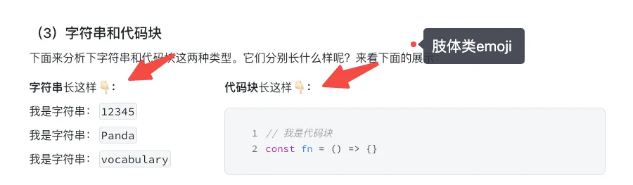 有时候我们可能会想要引导用户看上下左右的内容,这个时候可以考虑引入肢体类的Emoji,比如👆👇👈👉 ,来加强引导。具体示例如下:
