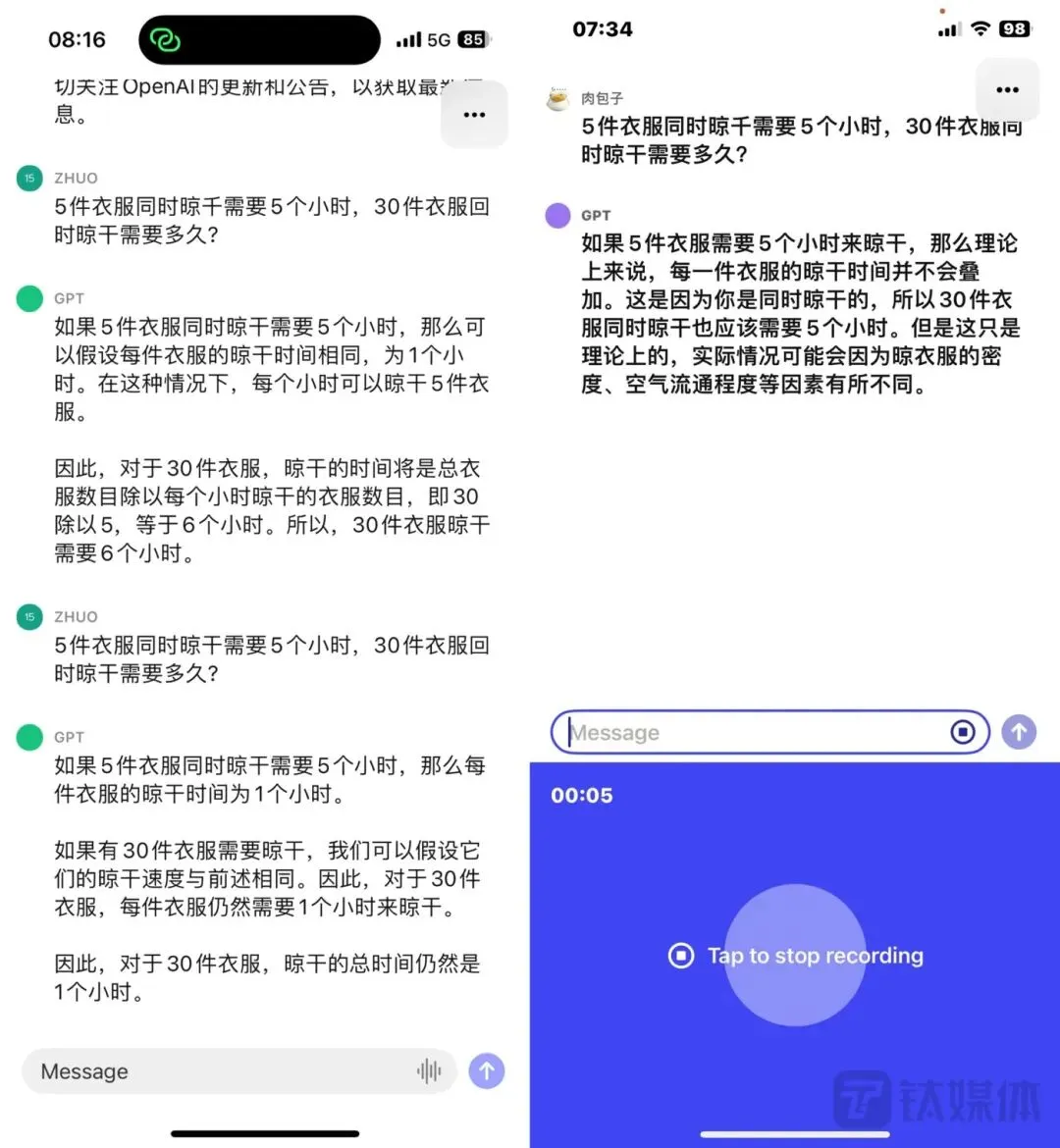 当然在测试过程中,钛媒体App也发现一些中文数学问题答的并不一定太好,甚至有“胡说八道”情况出现。比如5件衣服晾干需要5个小时,30件衣服晾干也需要5小时这类问题。