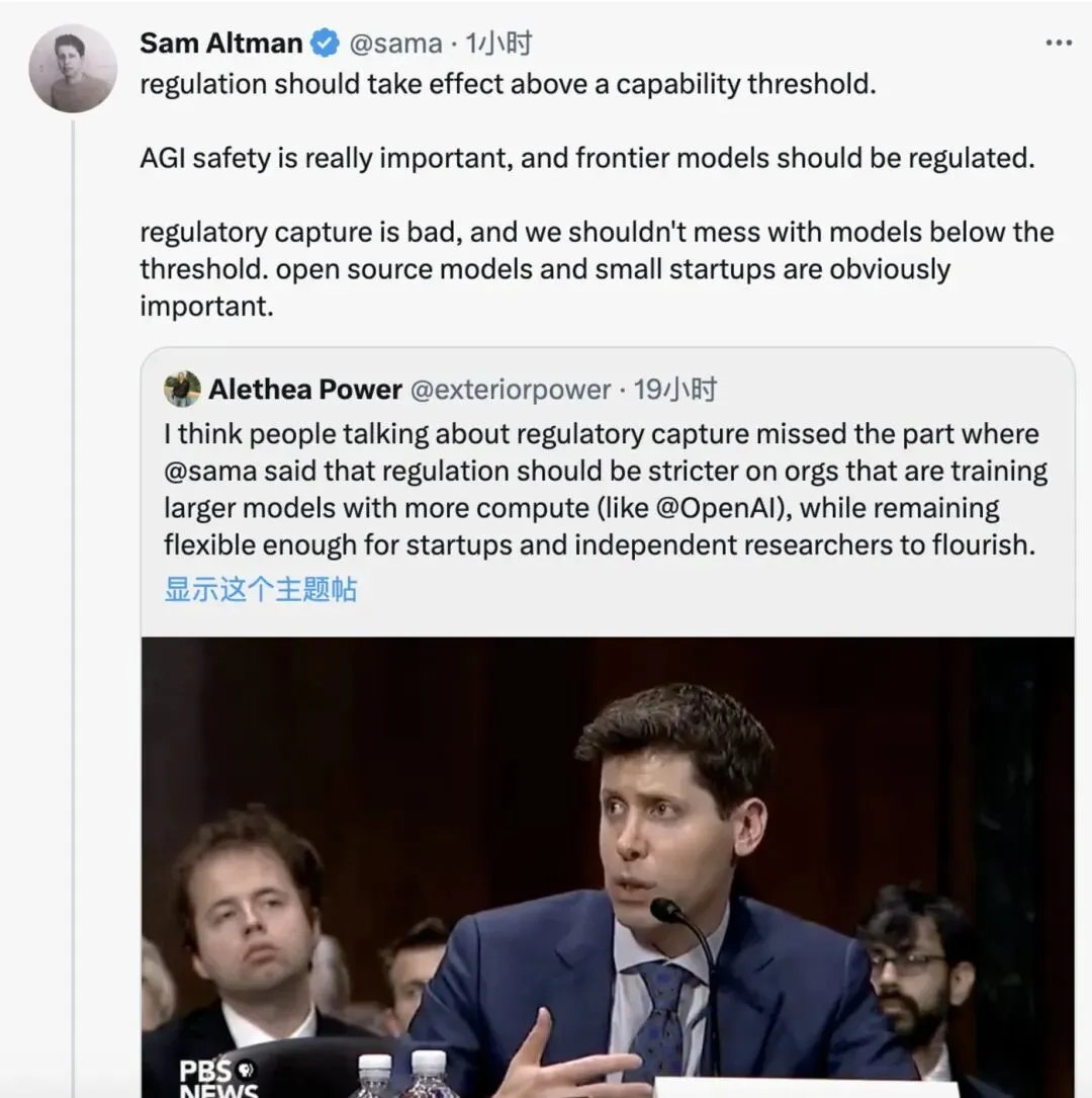 今晨奥特曼发布和回应了多条推文,核心还是讨论通用人工智能(AGI)技术监管问题。他表示,AGI安全性真的很重要,前沿模型应该受到监管,称不应该搞乱低于阈值的模型。他还借用发电做类比,认为太阳能电池板并不危险,因此监管起来并不那么重要,但核电站是需要监管的,因此必须实施针对AGI技术工作的监管。