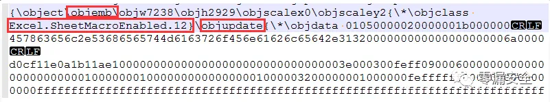 下载回来的10.doc实际上是一个RTF文档,里面内嵌了一个Excel.SheetMacroEnabled对象,Excel.SheetMacroEnabled是一个启用宏的Excel对象,相当于把一个带宏的Excel嵌入了Word文档中: