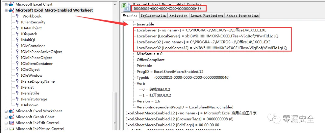 在OleView中查看Excel.SheetMacroEnabled对象,CLSID正是{00020832-0000-0000-C000-000000000046},并且LocalServer指向了EXCEL.EXE,这表示该对象对应的COM组件是一个单独的EXE组件,COM将通过其远程处理架构(通常涉及远程过程调用(RPC))来将这个exe加载起来,也就是说EXCEL.EXE将会和之前的Eqnedt32.exe一样,由COM直接创建而不是由WinWord.exe启动,这个特点可以有效对抗一些通过进程链来动态检测威胁的杀毒软件的查杀: