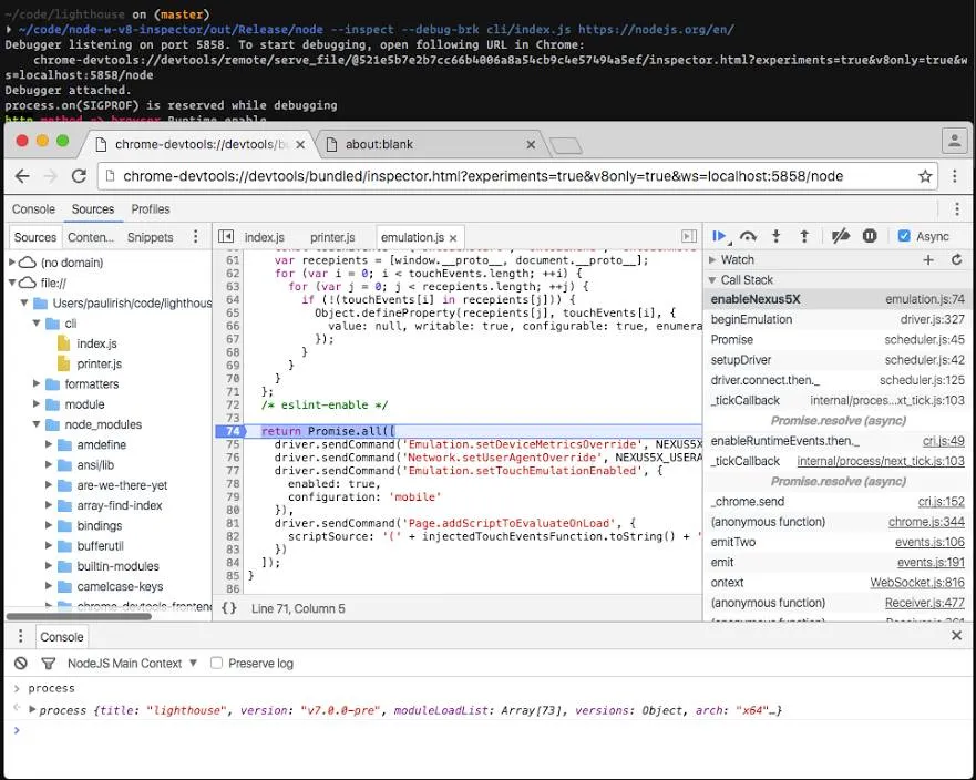 以--inspect参数运行你的Node应用程序,它会反馈你某个URL。将该URL复制到Chrome中并打开,你就可以使用Chrome DevTools来调试你的Node应用程序啦。详细的实验可以参考这篇文章。不过需要注意的是,该参数仍然属于实验性质