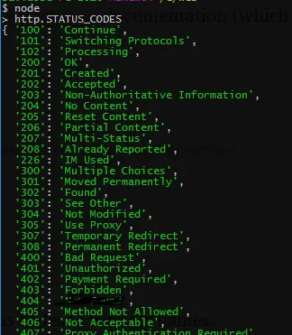 NodeJS帮我们内置了HTTP状态码及其描述,也就是http.STATUS_CODES,键为状态值,值为描述: