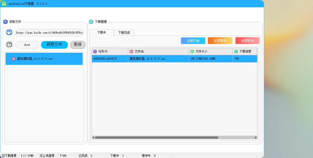 使用很简单,把分享的下载链接和提取码粘贴到软件里面,点击获取文件之后开始下载。经过测试下载速度的确很快,不过软件能坚持多久就不知道了,趁还没失效,需要的赶紧用了。