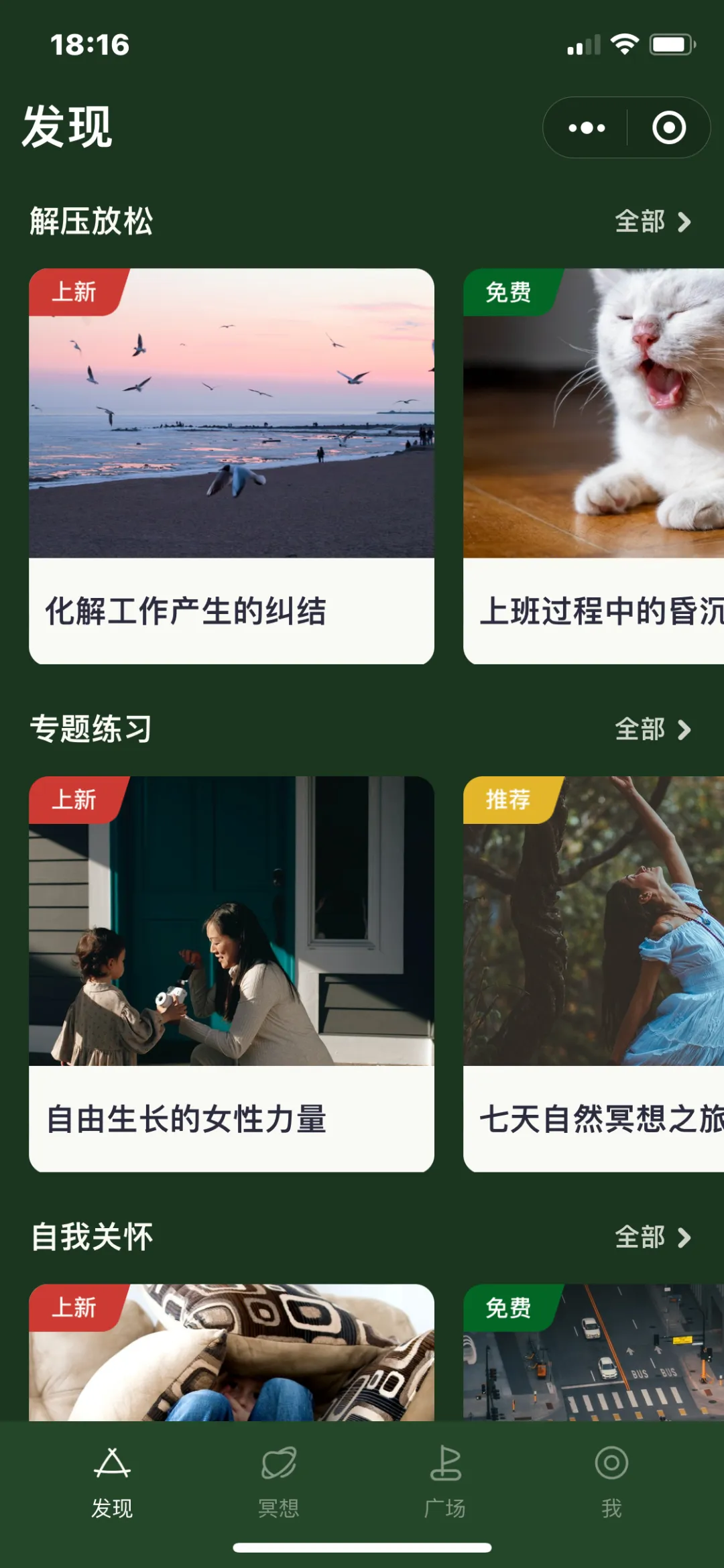 对于刚入门冥想的初学者来说,在「Heartly Lab」里面也提供了各种场景,例如有:施压放松、专题练习、自我关怀、安心助眠、生活场景、拥抱自然等等。