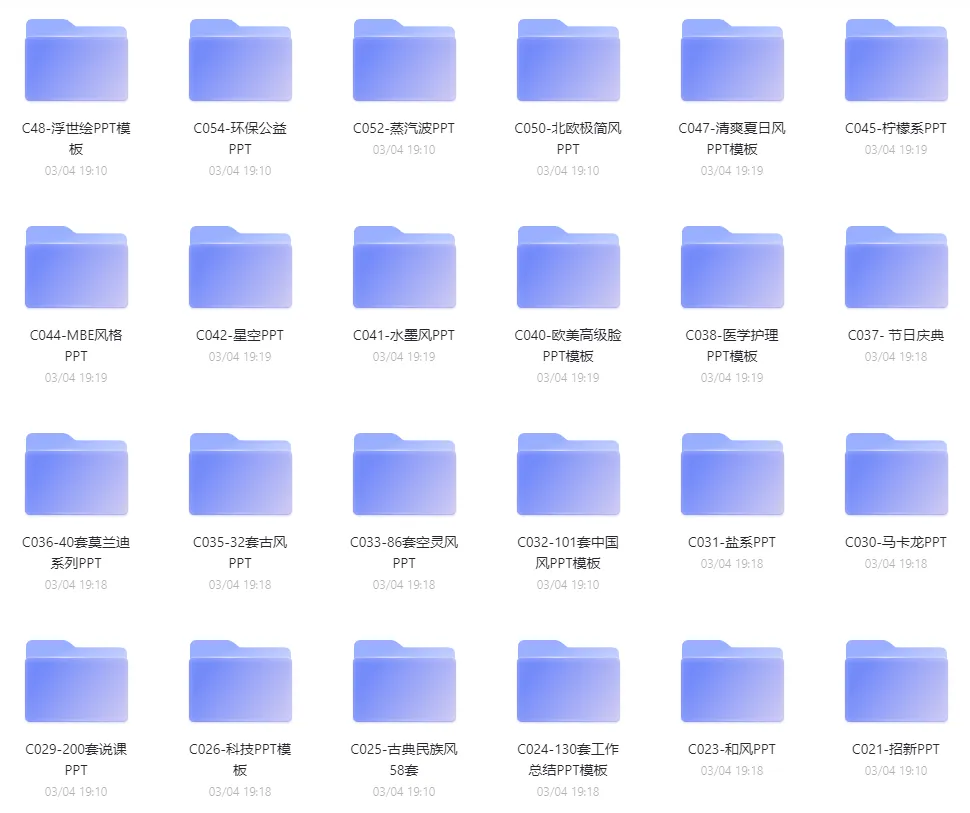 类型包括有国潮风、朋克风、商业计划、科技、工作总结、古典、水墨、医学模板、节日庆典、北欧风格、动漫卡通、环保公益、学术答辩等等……