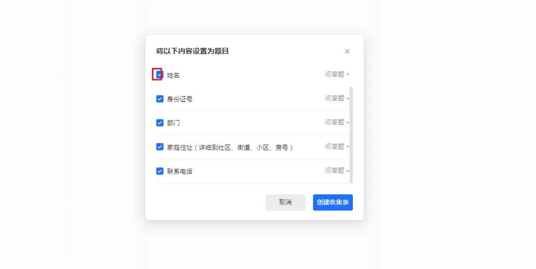 点击网页或客户端右上角A按键(编辑功能),选择创建收集表,基于工作内容创建,选择要收集信息的字段进行选择,完成创建收集表。因版本更新大家可以先将标题删除,系统默认选择第一行内容进行创建表单。