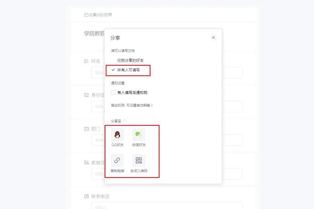 收集信息表创建完成,发布后,将编辑模式设置为所有人可填写,或指定某些人填写。选择分享收集表,可分享完成。