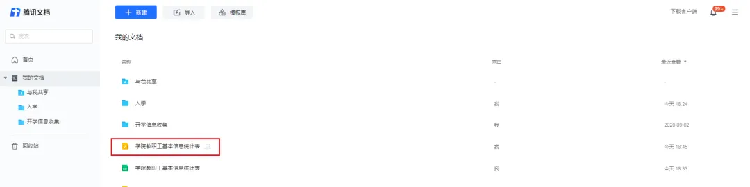 查看腾讯文档,最近查看-点击学院教职工基本信息统计表,就可以看到我们想要的数据了,既方便又确保大家隐私不被泄露。