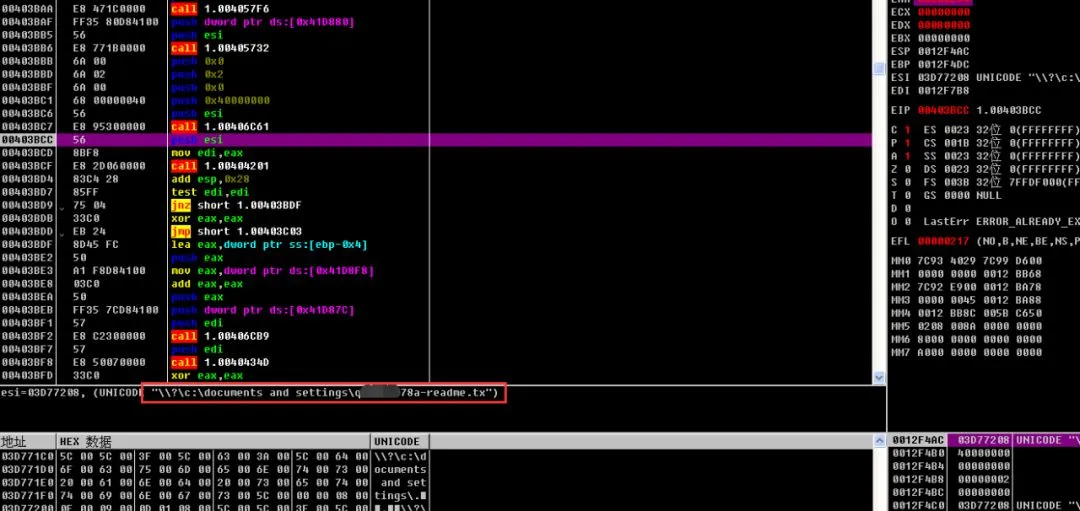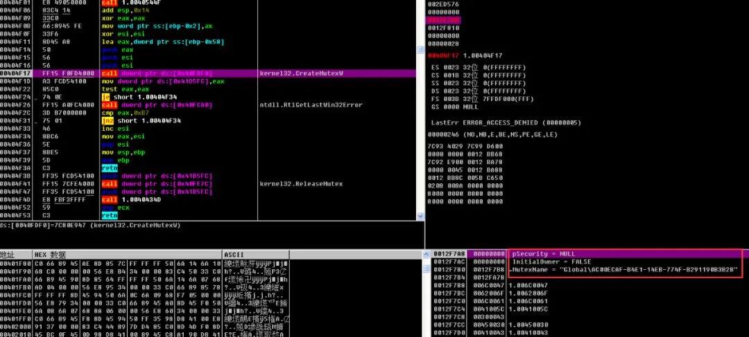 Sodinokibi(付款发票.xls.exe)运行后首先创建互斥体 “Global\AC00ECAF-B4E1-14EB-774F-B291190B3B2B”,以保证具有唯一实例。