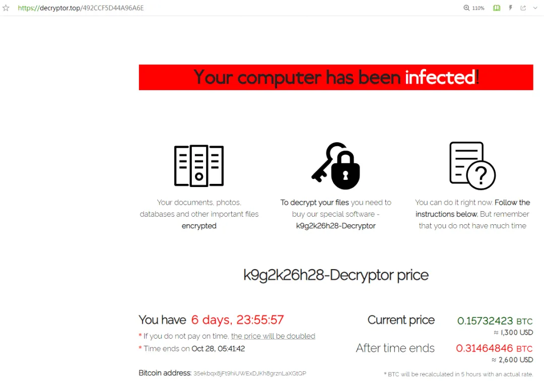 我们使用方法2访问进行查看,页面显示需要在6天之内购买并转账约0.15个比特币(约合人民币7800元)到比特币钱包35ekbqx8jFt9hiUWExDJKh8grznLaXGtQP,6天之后赎金会翻倍。