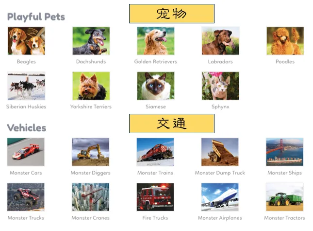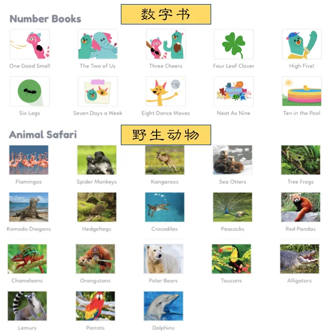 如果说第一种的主题场景模式适合孩子们自学,那么APP给出的第二种图书馆分类资源模式,因为分类特别清楚,所以就特别适合孩子在家长和老师的带领下进行更有针对性的学习。同时也有助于老师们在备课时,快速找到准确的资源。