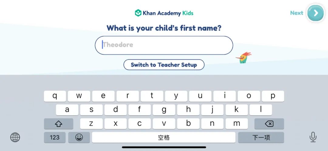 第四步:如果你有一个孩子,可以选择家长身份,输入孩子的名字。如果你有多个孩子,或者你是老师,你可以选择教师身份。“Switch to Teacher Setup”就可以切换到教师注册。