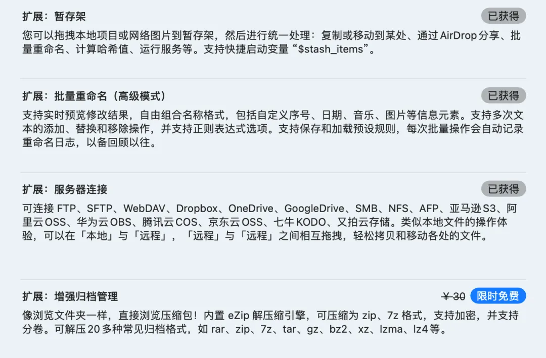 QSpace 还为用户提供了 4 款额外付费的扩展:连接服务器、批量重命名、文件暂存架和归档增强。