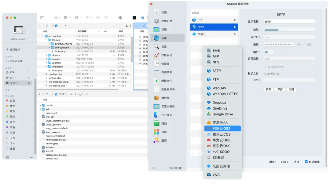 连接服务器扩展,支持 FTP、SFTP、SMB 等多种协议,可连接阿里、腾讯、七牛等对象存储,本地和云端轻松拖拽传输,无需再找传输软件了!