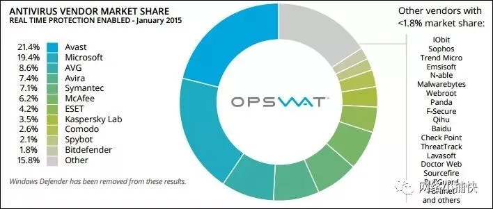 对于本文中的演示,我们将有两个Windows 7实验室机器,ENVY和GREED,加载了/ v软件。在GREED上,已使用最新定义更新了Microsoft Security Essentials(MSE)。在ENVY上,Symantec Endpoint Protection(SEP)12.1已安装并完全更新。我选择安装MSE因为它的受欢迎程度。微软目前拥有19.4%的反病毒市场份额,紧随业界领先者Avast的第二名。虽然赛门铁克只拥有7.1%的市场份额,但我之所以选择它,是因为我在几次交战中遇到了SEP,并花了很多时间试图绕过这个特定的软件。所以…与赛门铁克这是个人的!    在下图中,您可以看到a / v供应商市场份额的细分:来源:opswat.com,2015