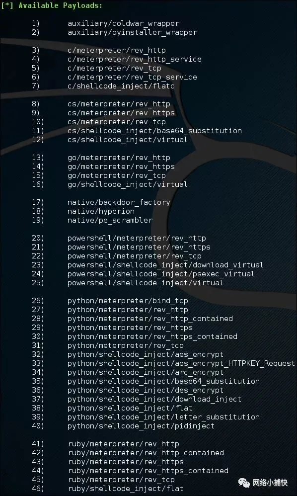 截至2015年9月,Veil-Evasion包含40多种有效载荷,可以选择多种语言: