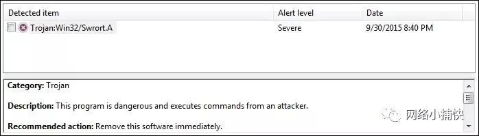 抓住!正如您所看到的,MSE已将此可利用标记为恶意攻击。为什么是这样?虽然确定特定a / v软件标记为恶意的确切元素可能很困难,但在测试社区中众所周知,a / v供应商已为标准Metasploit可执行模板编写了签名。这些模板是插入编码器生成的shellcode以创建可执行文件的“容器”……这些模板是静态的。这意味着,即使您的shellcode未被/ v软件检测为恶意,模板本身也很可能会被标记,无论如何。这是a / v供应商寻找标记恶意文件的快速方法的主要示例。