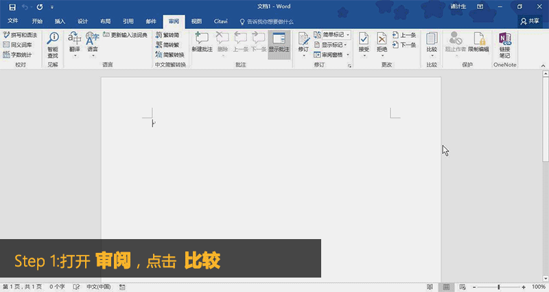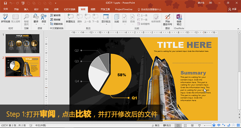 Step 1:与Word中的比较功能不同的是,PPT中的比较首先需要打开原文档。然后再启用审阅工具栏中的比较功能,并打开修订后的文档。