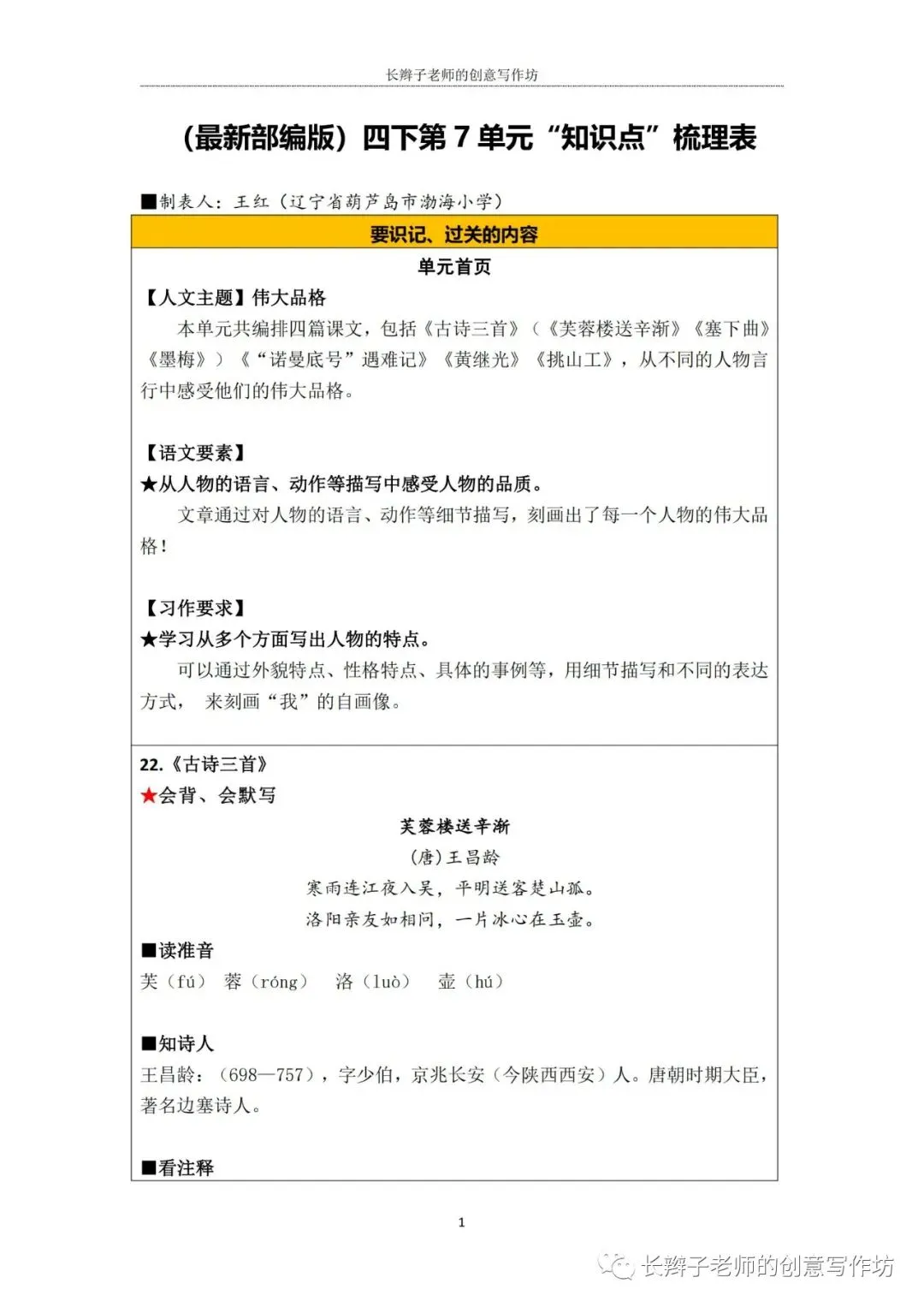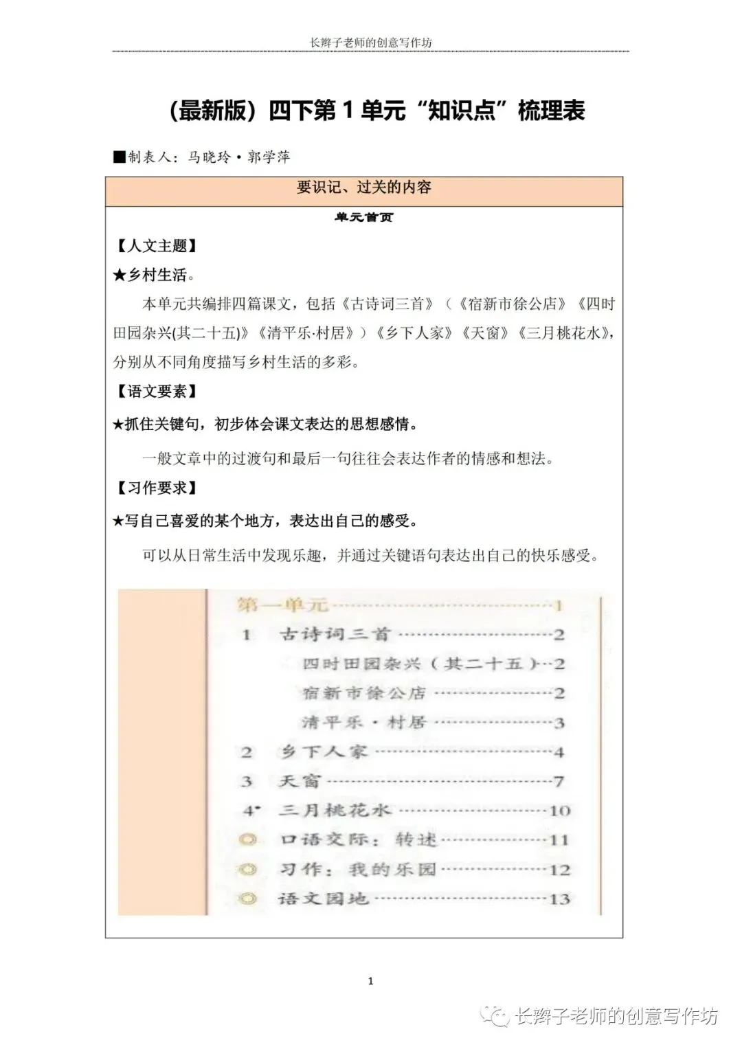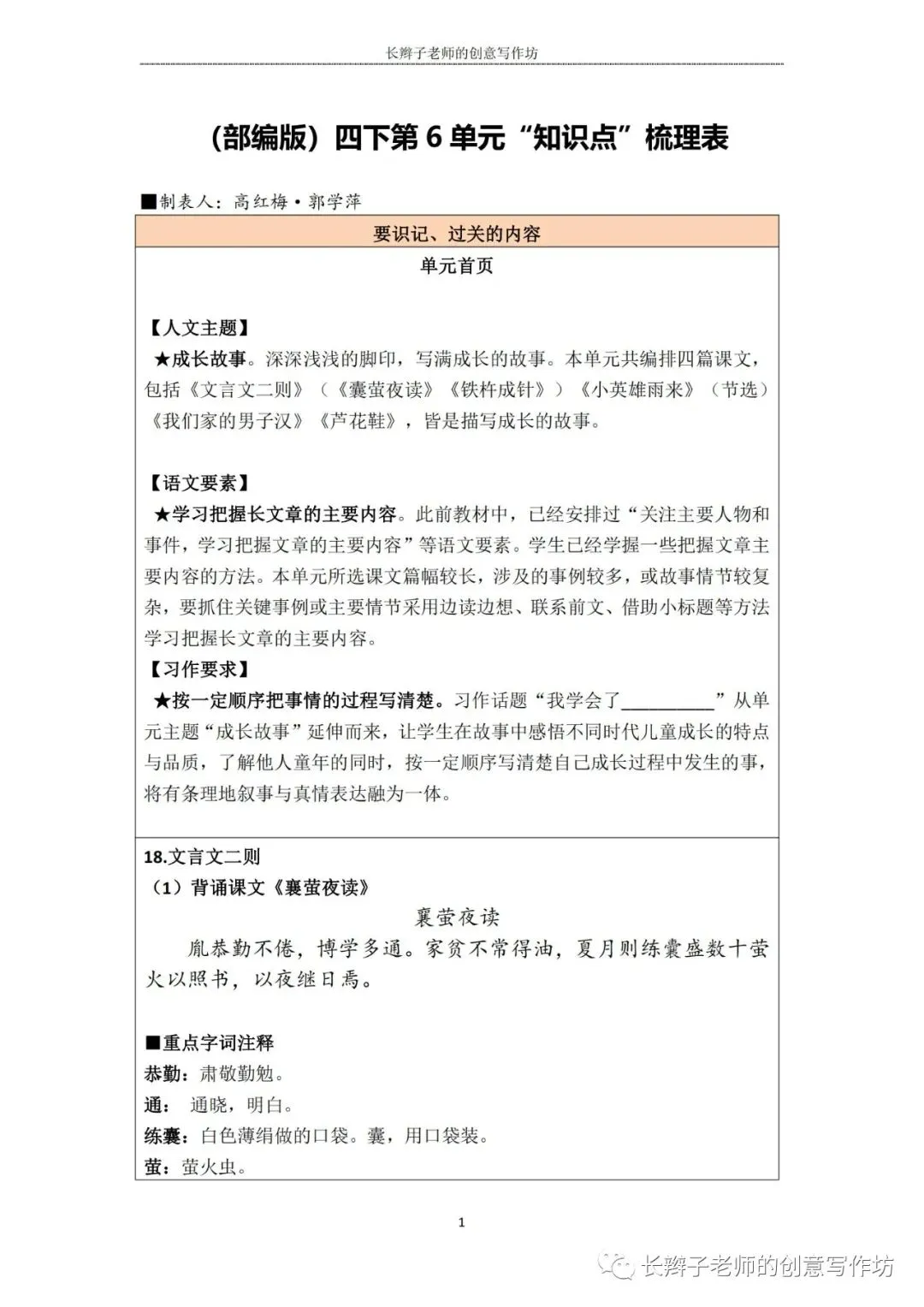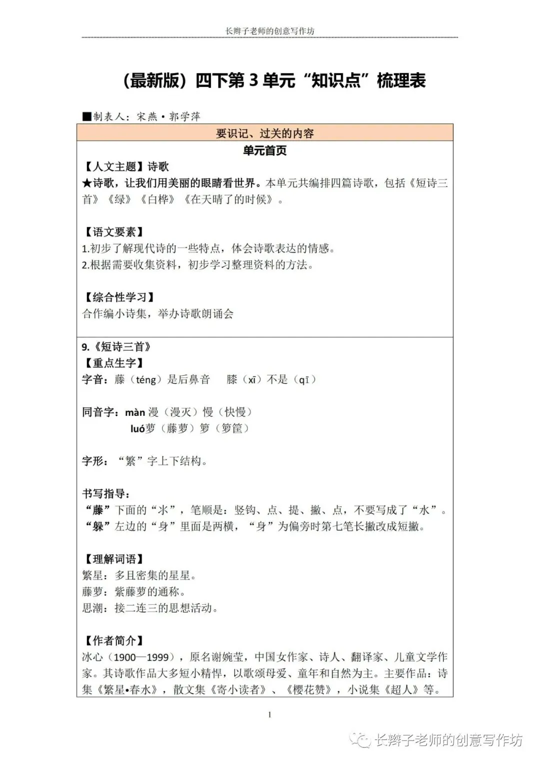 若需要(“四下1-8基础知识汇总表”),请关注微信公众号“长辫子老师的创意写作坊”,在首页对话框写下——四下知识点,便会自动弹出提取链接。