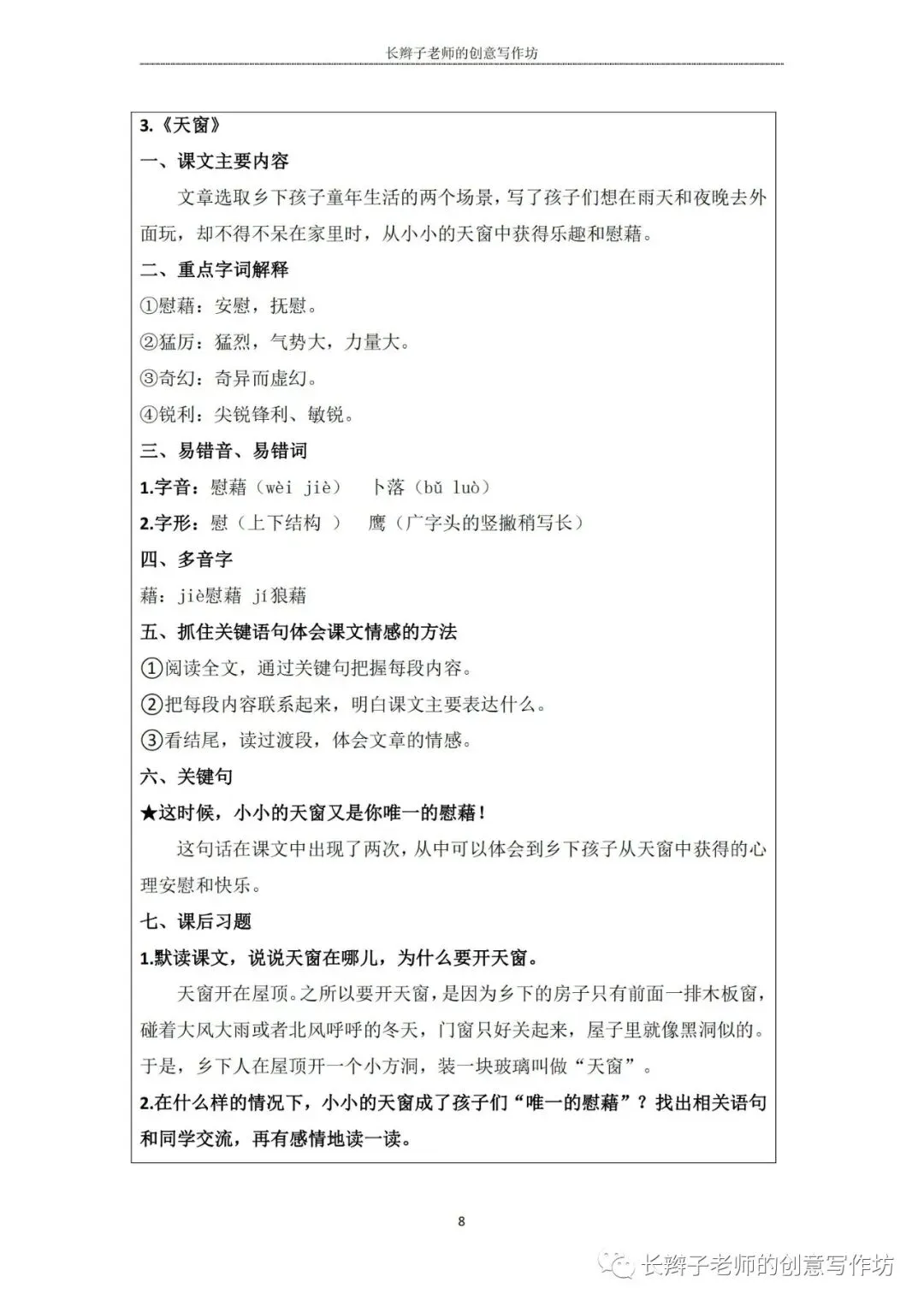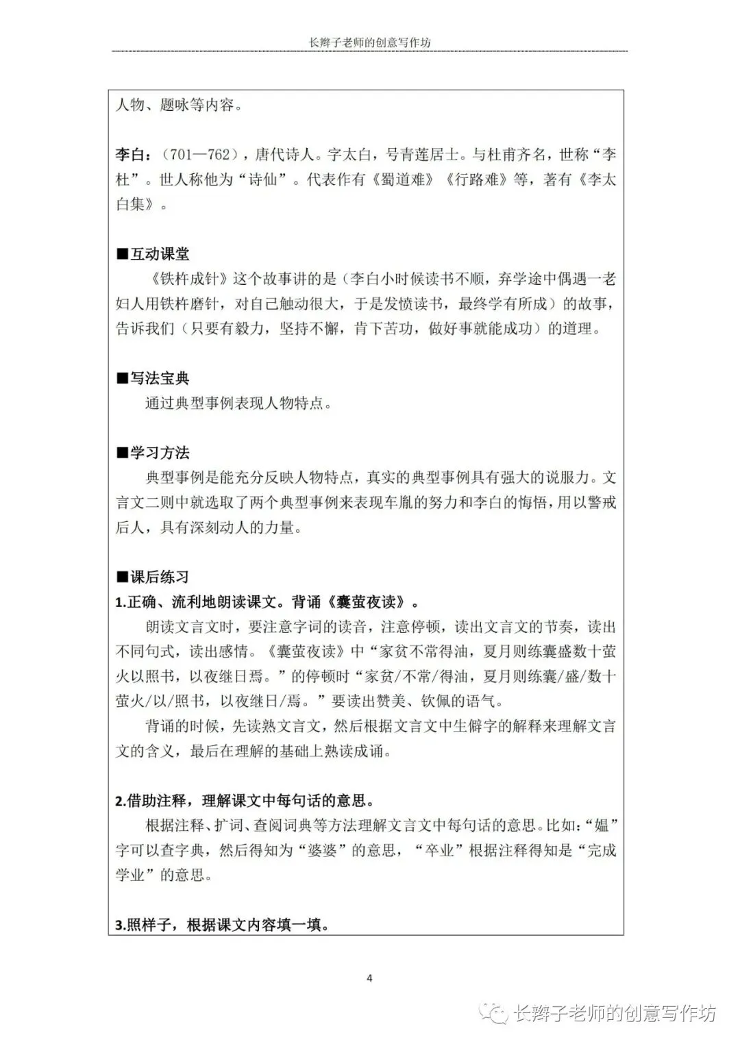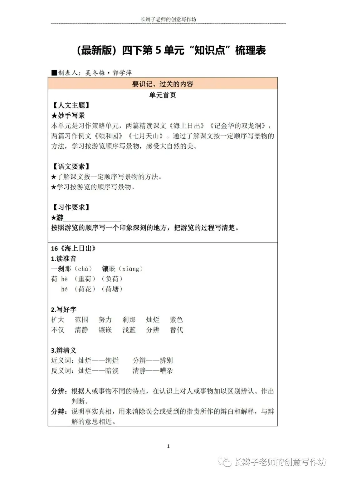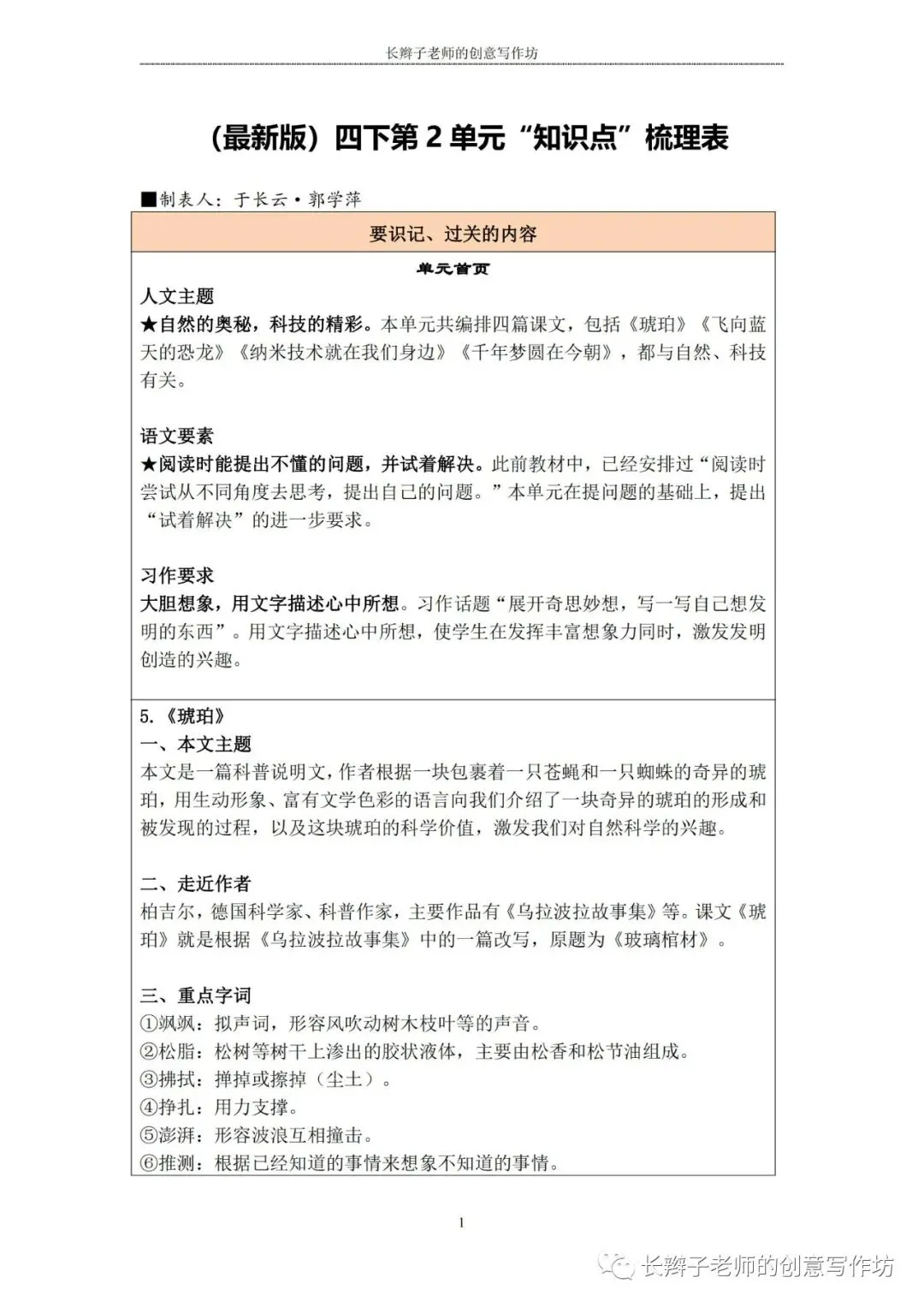 若需要(“四下1-8基础知识汇总表”),请关注微信公众号“长辫子老师的创意写作坊”,在首页对话框写下——四下知识点,便会自动弹出提取链接。