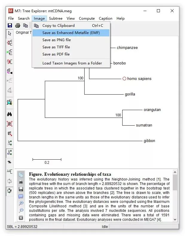 主要有两种方法:第一种,在Tree Explorer窗口Ctrl+C将进化树复制到剪贴板,然后粘贴到Word中;第二种,将进化树导出为emf格式的图片(如下图),然后在Word中插入emf图片。