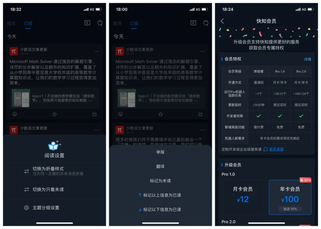上周,信息订阅应用「快知」迎来了 2.0 版更新,新版主演在信息流优化和收费模式上进行了变动。新版在 1.4 版「折叠模式」的基础上新增了「只看未读」功能,你不仅可以将当日同一主题消息进行折叠,还可以自动隐藏已读内容,进一步压缩信息流的量级,提高你查阅的效率。为了进一步提升效率,应用还在消息卡片中增加了「批量已读」模式,你可以批量操作「标记以上信息为已读 / 标记以上信息为未读」,迅速「干掉」你庞大的信息流。 此外,新版在自建主题上增加了「创建者审核」这一功能,选用「创建者人工审核」过滤器后,主题创建者可以手动对主题内信息进行筛选,只有经过创建者审核发布的信息,订阅主题的人才会看到。在使用机器人抓取消息时,如果出现消息重复、垃圾消息或是敏感内容时,你可以通过手工过滤的方式,进一步确保主题消息的有效性。在新版本中,大部分机器人面向所有用户直接开放,主题追踪任务个数不限,包括常用的 RSS 解析机器人、每日天气提醒、什么值得买优惠信息等。但部分追踪资讯时消耗资源较多,且开发成本较高的机器人,则会被列为 Pro 机器人,仅向体验者及 Pro 会员开放,目前包括微信公众号追踪、B 站投稿更新、微博用户内容追踪等。关注少数派,在后台回复「App」即可获得下载链接。快知设置了两档会员等级,Pro 1.0 每月 12 元,2.0 每月 30元,两档差异主要在机器人可用数量和任务追踪数上。需要注意的是,非 Pro 用户在消息更新上可能会有小于 30 分钟的延迟,具体的收费规则和特权可以在应用中查看。你可以在 App Store 免费下载快知,使用激活码最多可免费使用 8 个付费机器人;你也可以使用快知的网页版本。