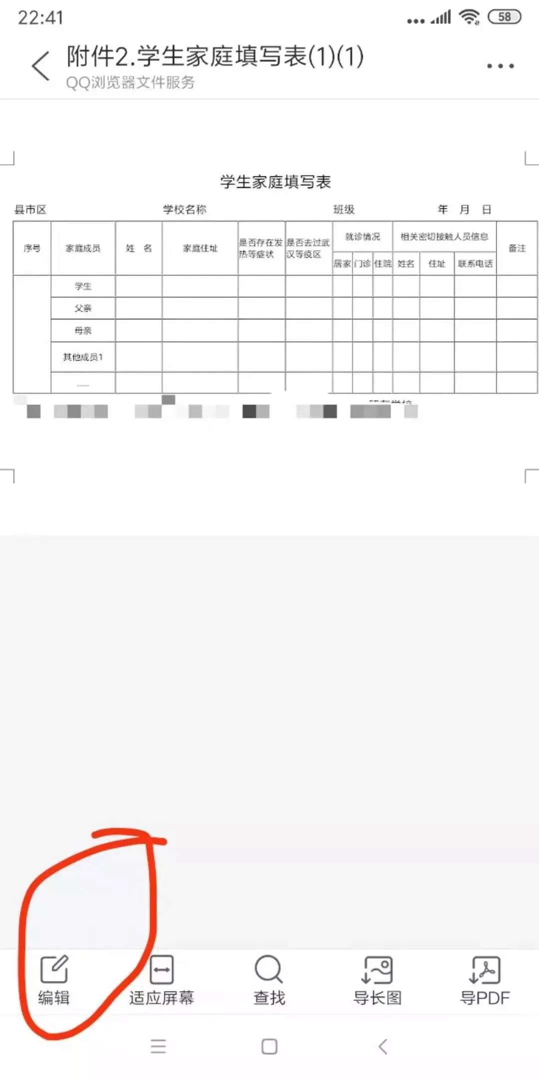 1.点开文件(若提示下载QQ浏览器,下载),点击右下角的【编辑】,如图:
