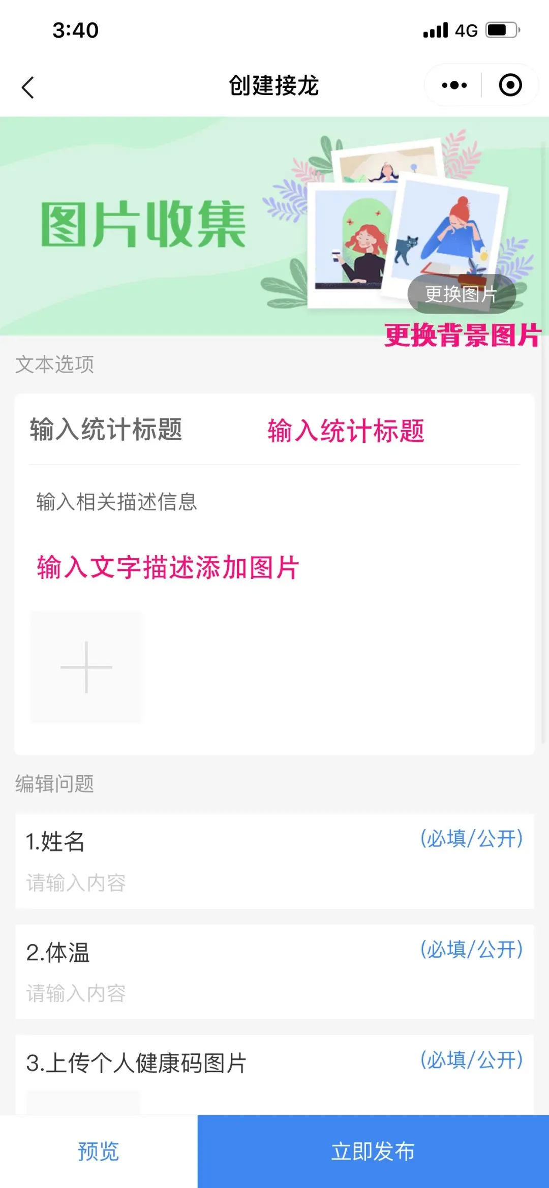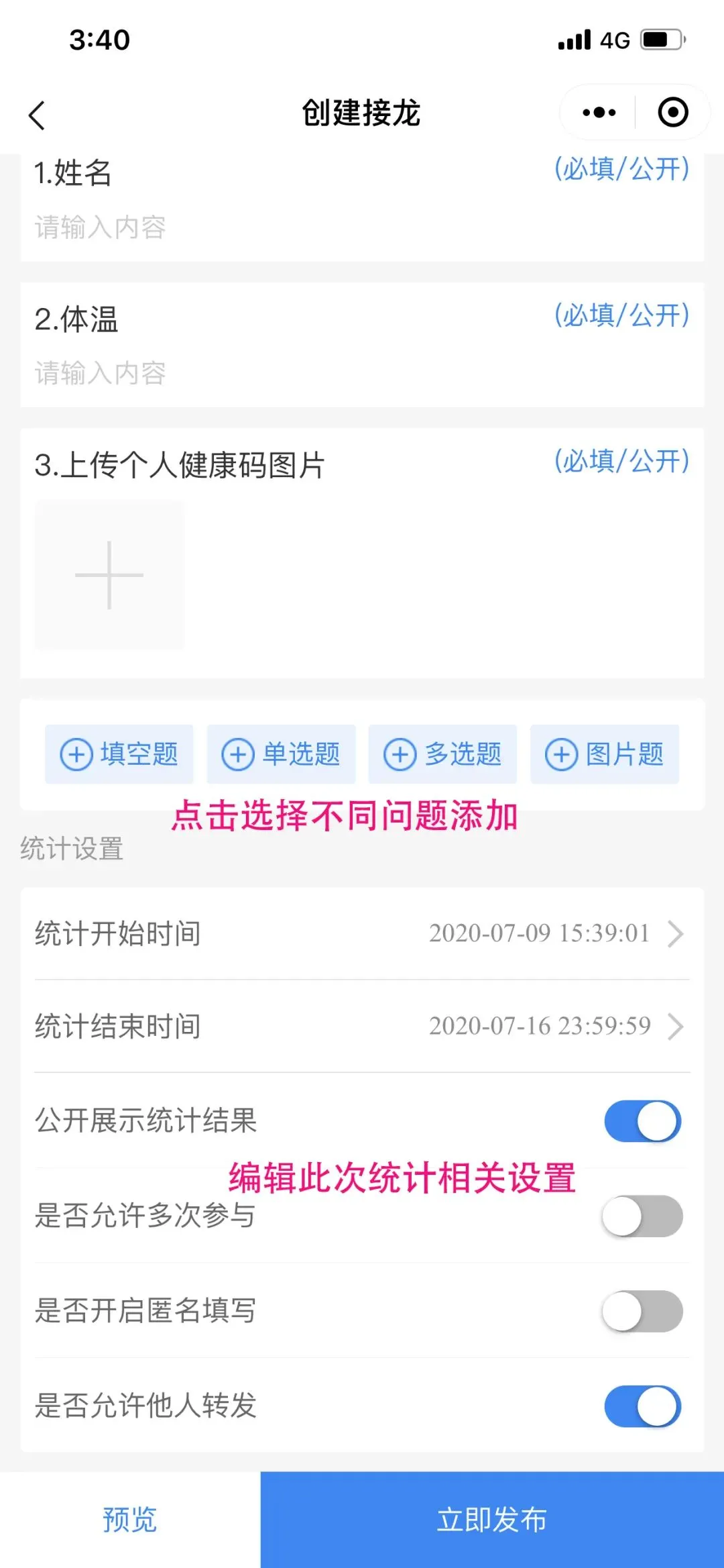 一些朋友可能还不清楚什么是接龙统计表格,其实简单的说就是我们只要输入一个简单文项就可以转化成接龙表格进行使用,并且参与者不仅可以使用消息发送到微信群和好友进行使用,还可以点击查看详情内的下载海报通过海报二维码进行分享邀请。