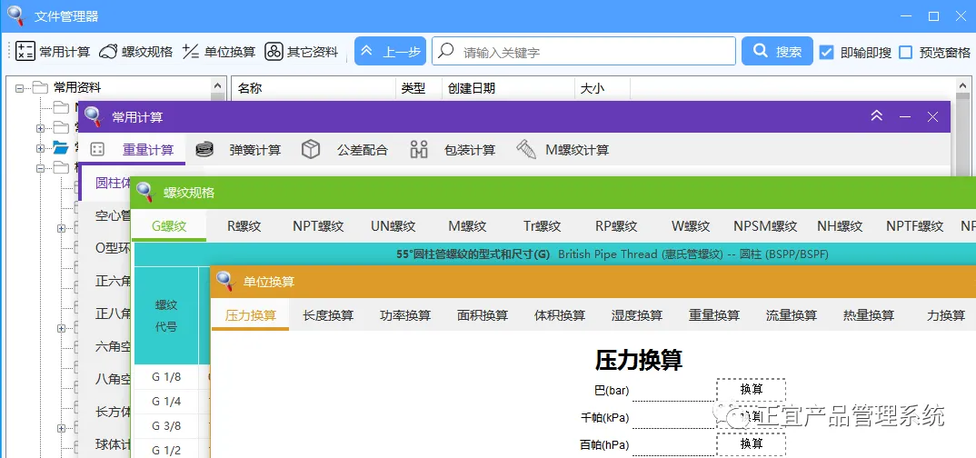 “文件管理器”的设计灵感来源于Windows资料管理器,它在保留了常用功能的基础上,增加了更多实用功能。首先,配备了常用计算功能,包括重量计算、弹簧计算、公差配合、包装计算以及M螺纹计算等。这些功能可以快速解决工作中遇到的相关问题。此外,还整理了常用螺纹规格表,提供了一站式的查询服务。