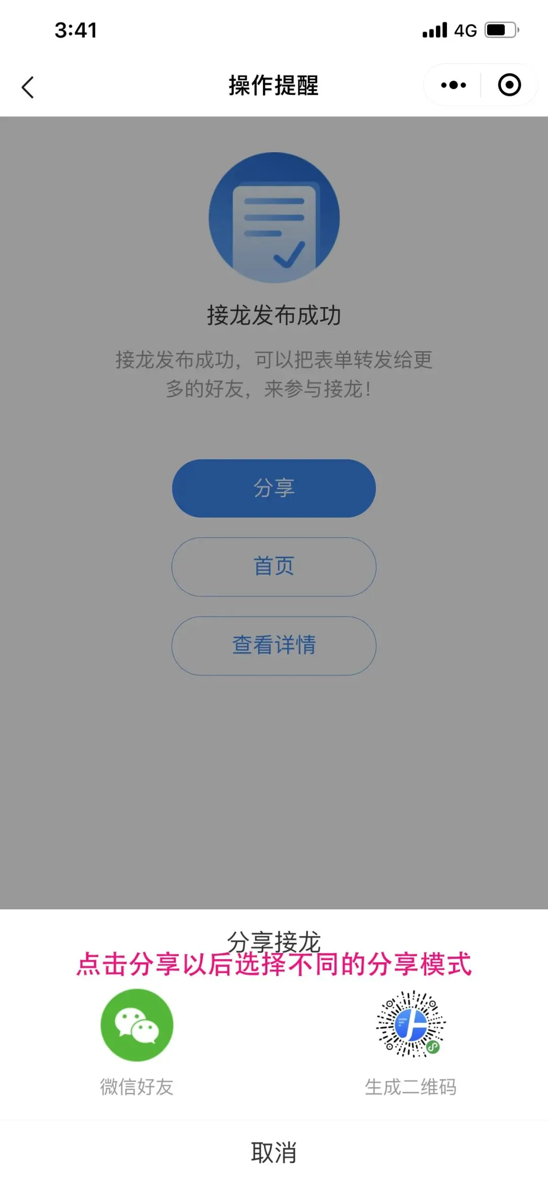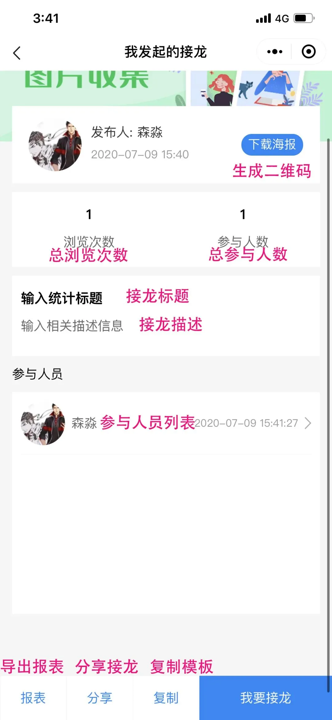 一些朋友可能还不清楚什么是接龙统计表格,其实简单的说就是我们只要输入一个简单文项就可以转化成接龙表格进行使用,并且参与者不仅可以使用消息发送到微信群和好友进行使用,还可以点击查看详情内的下载海报通过海报二维码进行分享邀请。