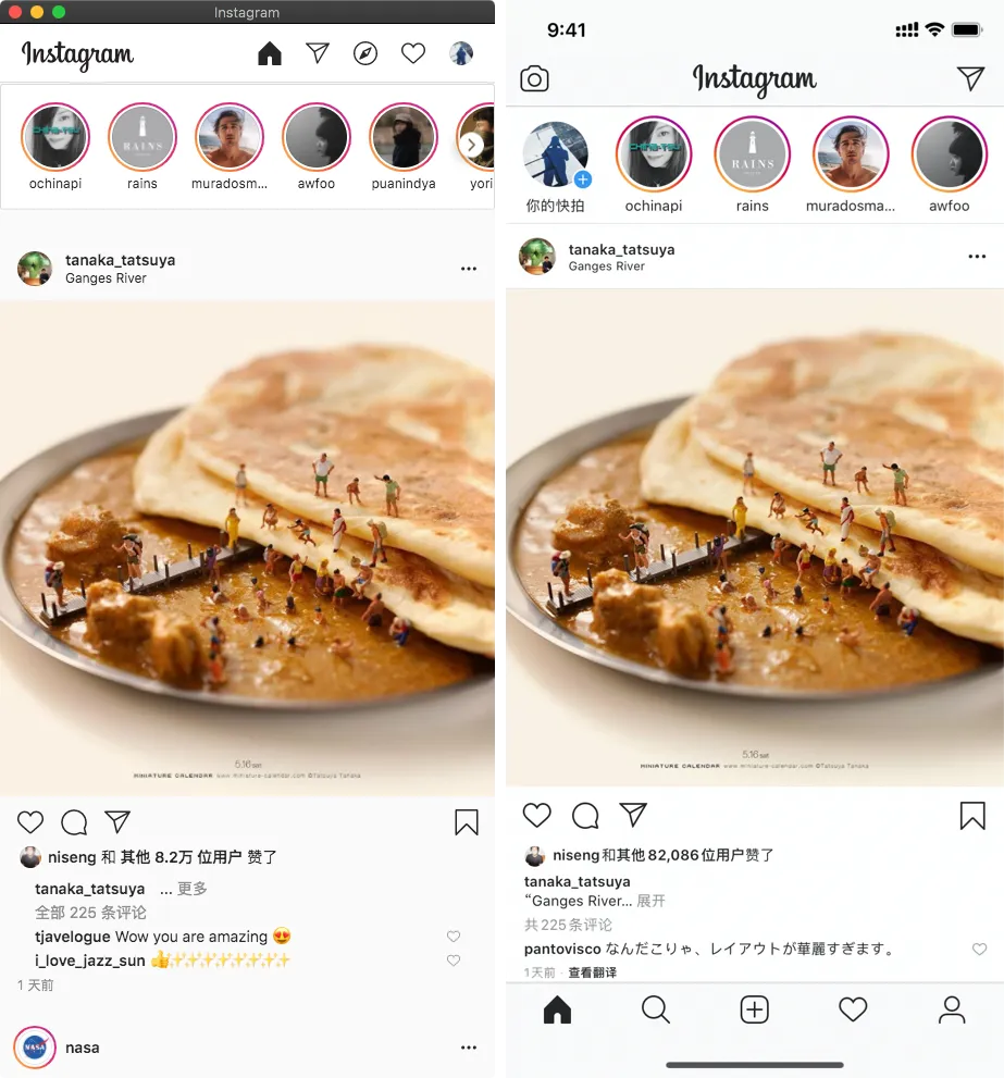 根据我的经验,如果将支持 PWA 特性的网页使用 Coherence X 封装之后的体验还不错。例如下方的 Instagram,左侧是 Coherence X 封装的应用、右侧是 iOS 版本的应用。而不支持 PWA 特性、甚至非响应式设计的网页,建议使用浏览器直接访问。