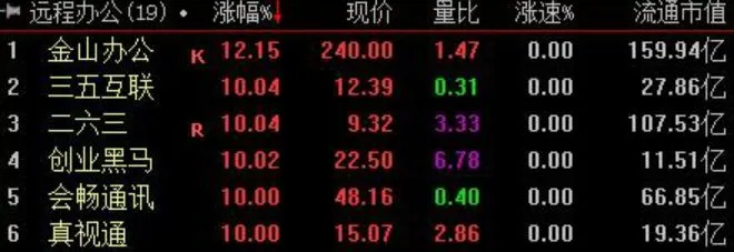 今日远程办公题材再度呈现市场爆发,盘中金山办公、三五互联、二六三、会畅通讯、真视通等个股强势拉升封死涨停,齐心集团、创业黑马、华平股份、视源股份、泛微网络等个股盘中跟风大涨,盘中远程办公题材受到追捧呈现市场走强。