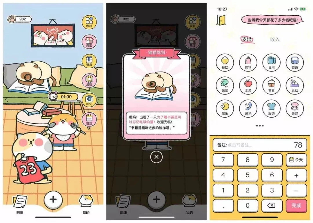 最近因为疫情的关系一直「困」在家中,「宅」到致郁。一郁闷就忍不住想花钱寻开心,完全无法控制刷淘宝的双手。而上周出现在 App Store 新应用推荐里的「喵喵记账」,则会让购物的治愈效果更加理想,因为在你购物记账的同时,就会有可爱的喵星人到访,还有什么比边购物边撸猫更能抚慰人心的?喵喵记账作为一款账本应用,基础功能基本能满足日常使用。应用支持收入和支出的双向统计,有较为丰富的分类,可以按年、月或周查阅统计图表,并且支持设定预算,或许可以在一定程度上抑制你消费的冲动。应用最大的特点,就是在你每天前三笔记账时,会有猫咪来到你的小屋。不同类型的账单条目会吸引不同的猫咪。通过点击的方式撸一下到访的喵喵,它们还会跟你说说话。你可以通过签到或其他任务赚取「喵饼」,给可爱的喵喵们买小鱼干吃,也可以添置新的家装来吸引更多喵喵。如果你不是重度记账用户或是严苛的账单分析者,喵喵记账可以在满足日常记账需求的同时,提供各式各样的喵喵来萌化你的心,让你轻松当上「铲屎官」。你可以在 App Store 上免费下载喵喵记账。关注少数派,在后台回复「App」即可获得下载链接。