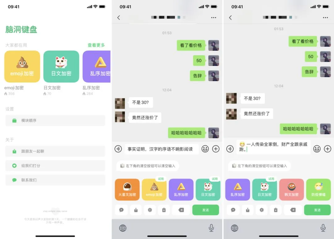 事实证明,汉字的顺序并不一定影响阅读。对于人类来说是如此,但对于检测关键词的 AI 来说就不是这么回事了。脑洞键盘可以帮你用多种方式来加密自己的话,可以保护你的隐私,独特的加密方式也能给你带来不少欢乐。脑洞键盘支持乱序加密、火星文加密、Emoji 加密等,除了乱序和火星文外,其他的加密方式都需要脑洞键盘才能解密。在使用时,你需要先用其他输入法打字,再用脑洞键盘来加密。在疫情期间,脑洞键盘还提供了「防疫横幅」的功能,它会为你自动生成用于宣传防疫的口号。由于应用是以键盘扩展的形式运行的,它的加密不受应用限制。别人用脑洞键盘加密的内容,你只需要复制后切换至脑洞键盘即可解密。应用中的 Emoji 加密和日语加密均为收费功能,价格为每项 3 元。你可以在 App Store 免费下载脑洞键盘。关注少数派,在后台回复「App」即可获得下载链接。