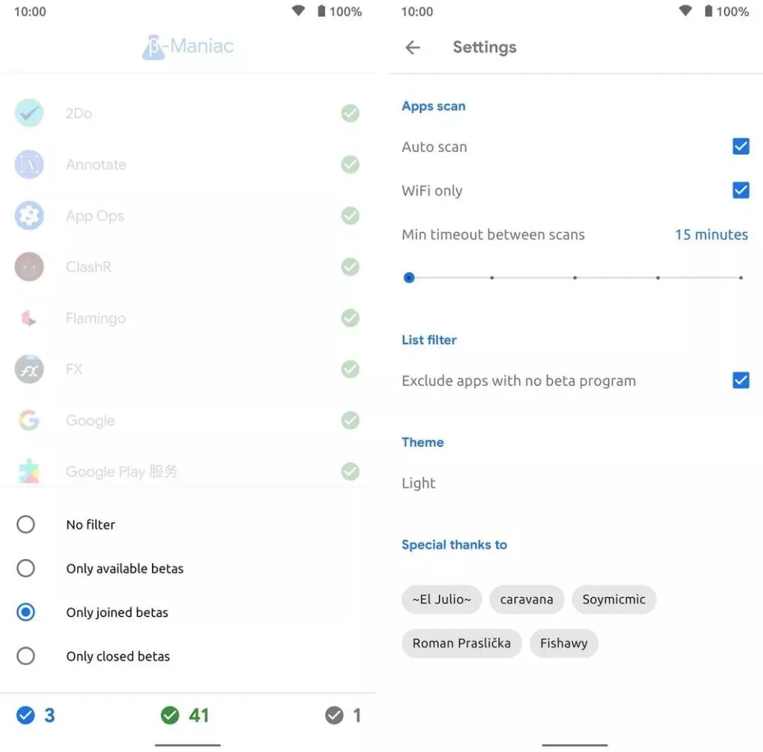 对于热衷于寻找各类应用的尝鲜党来说,除了及时更新手机应用外,加入应用的 Beta 版提前感受应用的新特性或是协助开发者发现 Bug 都不失为是一种独特的乐趣。针对应用下载和更新的问题,少数派之前曾经对各类应用商店进行了梳理。那么有没有能够便捷地获取测试版应用,免去我们在各个开发者群组东奔西跑的途径呢?下面要介绍的 Beta Maniac 就是一个不错的工具。使用 Play Store 的用户对其内建的测试版应用渠道应该不陌生,出于尝鲜等目的我们会加入各种应用的测试版,但是当前应用是否有测试版,测试版又是否在 Play Store 进行了分发,都需要我们逐个点进应用详情页去查看,费时费力。Beta Maniac 则能帮助我们进行统一检索。下载 Beta Maniac 后,为了检测我们当前安装的应用是否已经加入了测试版,需要我们使用自己的谷歌账号进行登录,登录完成后,Beta Maniac 会对我们手机当中的全部应用进行扫描,并将扫描结果以一种直观的方式呈现出来。对于有测试版且我们已经加入的应用,Beta Maniac 会以绿色对勾来呈现;对于有测试版但我们尚未加入的应用,Beta Maniac 会以蓝色对勾来呈现;对于有测试版应用但当前测试人员已满的应用,Beta Maniac 会用灰白色对勾做标记,并且支持在测试项目有空位时提醒我们加入。此外,Beta Maniac 还能够检索没有在 Play Store 开放测试渠道的应用,并支持手动刷新和自动刷新以检索应用测试版开放情况,免去我们手动查找之苦。你可以在 Play Store 免费下载 Beta Maniac。关注少数派,在后台回复「App」即可获得下载链接。