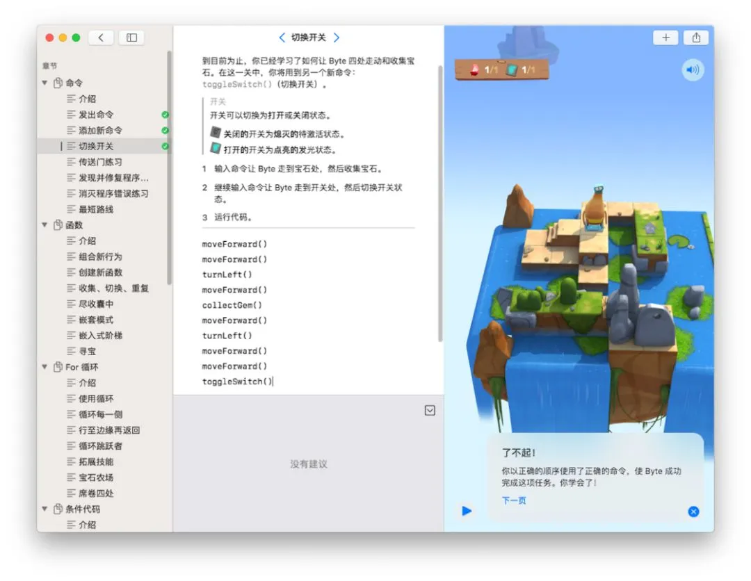 Swift Playgrounds 是 Apple 在 iPad 上推出的编程学习应用,其目的是用图形化以及游戏化的方式帮助用户学习 Apple 的编程语言 Swift,不过这款应用自推出以来一直都只支持 iPad,而不支持 Mac。随着 Apple 推出了跨平台应用移植方案的 Project Catalyst,这款学习工具也终于在近期上架 Mac App Store。和 iPad 版功能基本类似,Mac 版 Swift Playgrounds 同样采取了游戏和代码相结合的方式,只不过输入的方式从单纯的触摸屏虚拟键盘变成了通过实体键盘输入,倒是真有点儿小程序员学习的味道。我们只需要将内置的教程下载下来,然后打开每一个小章节,根据提示让右侧的游戏动画根据代码完成各项任务即可。但或许是 Project Catalyst 技术尚不成熟的缘故,这款看上去最适合键盘操作的 iPad 应用在 Mac 上的使用体验并不算好,比如我就遇到了右侧游戏动画卡顿、只有三行命令就能运行的应用却几乎失去响应甚至直接报错闪退等问题。与这些问题一起来的,是我的 MacBook Pro 发出的巨大风扇噪音(几乎可以比拼我运行 Xcode 编译项目时的风扇噪音)。更别提 Apple 几乎没有优化编程课程在国内的下载速度——下载一个最基础的教程就花费了我近三个小时的时间,显然在这款跨平台应用还没有完全优化到位。也许这也是这款 Apple 原生应用在 Mac App Store 仅获得仅 3.9 分原因,这让我联想到相当多的第三方应用积极适配 Project Catalyst 技术却遇到了严重的交互问题和体验下降等,这些问题在 Swift Playgrounds 似乎将这些问题进行了进一步放大。希望在今年的 WWDC 上,Apple 可以进一步改善这个跨平台框架,至少在自家的产品方面别首先「翻车」。你可以在 App Store 和 Mac App Store 免费下载 Swift Playgrounds。关注少数派,在后台回复「App」即可获得下载链接。