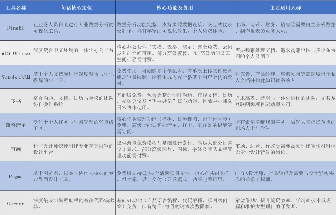 A:千万不要试图一次性全部掌握,先看看自己的工作痛点在哪里,如果你每天被数据报表折磨,就从FineBI开始;如果团队沟通成本太高,优先试试飞书;如果写作和研究需要处理大量文献,NotebookLM能立刻帮到你。集中精力用好一个,让它真正为你创造价值,然后再根据需求自然引入下一个。工具的组合,最终是为了构建一个属于你自己的、顺畅高效的工作生态系统。