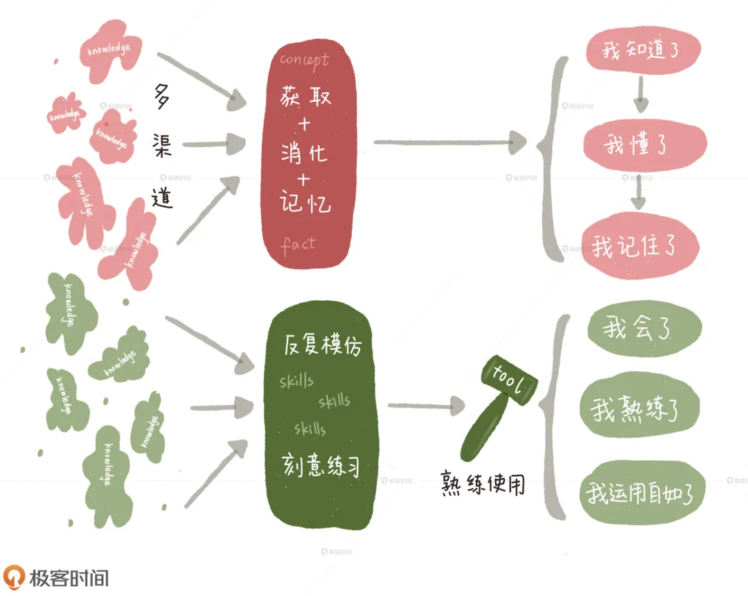 二者的区别在于,前者是多渠道获取、消化和记忆信息的过程,主要通过理解概念和知悉事实,达到“我知道了、我懂了、我记住了”的效果;而后者是在已有知识的基础上,通过反复模仿和刻意练习,达到“我会了、我熟练了、我运用自如了”的效果。
