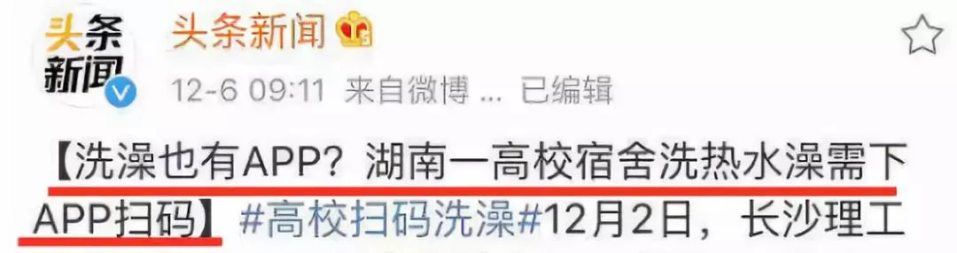 你看,前两天长沙某高校突然发放了一则通知——取消原本的热水卡,以后需要下载一个APP,扫码才能进行洗澡。
