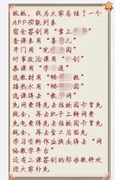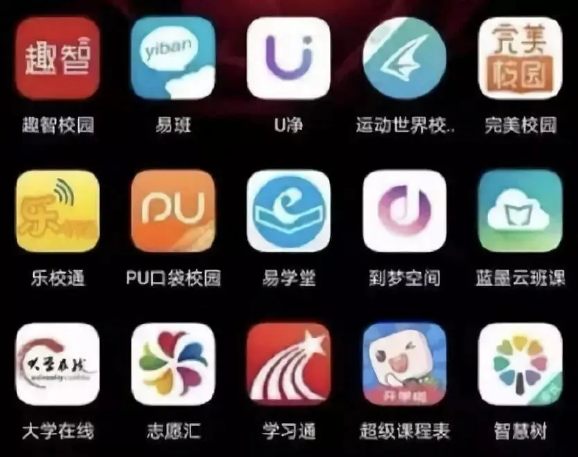 选课一个APP、选教材一个APP、门禁一个APP、签到一个APP、查课表一个APP、查成绩一个APP、英语课一个APP、时事政治课一个APP、查寝一个APP、投票一个APP……这种常见的也就算了。