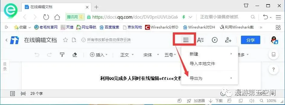 查看文档编辑情况,打开在线编辑完成的文档,单击如下图所示图标,单击“导出为”就可以了。