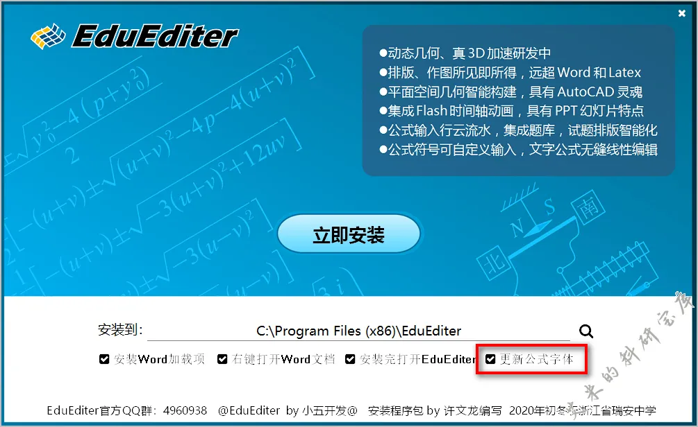 这款软件叫EduEditer,是一款专业的教学文档和课件编排软件,它提供了编辑公式、绘图、动画等一整套完整的解决方案,软件大小不到50M,安装时请注意勾选更新公式字体,如果字体显示不正常,请重启电脑后再使用!