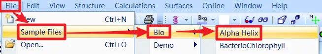在【File】的【Sample Files】中存在以下分组:Bio;Demo;Docking;Drug;Inorganic;Nano等。选取所需分组下的相应模型,即可在编辑界面和Chem draw界面中观察到对应的二维结构和三维图像结果。
