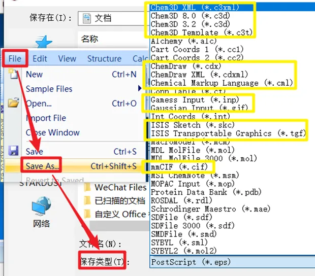 在【File】中【Save As】选项中选择Chem 3D的保存文件格式,可再次被Chem 3D打开并编辑的文件格式为图中黄色框框选出的五大类。