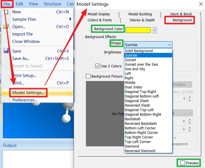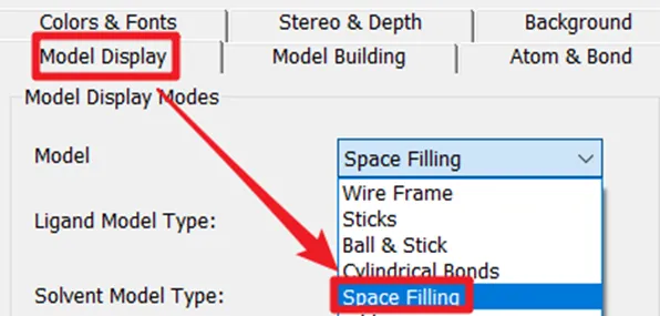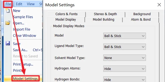 模型参数设置中主要包含六种功能选项卡,包括【Color&Fonts】颜色和字体、【Stereo&Depth】立体和深度、【Background】背景、【Model Display】模型显示、【Atom&Bond】原子和键。